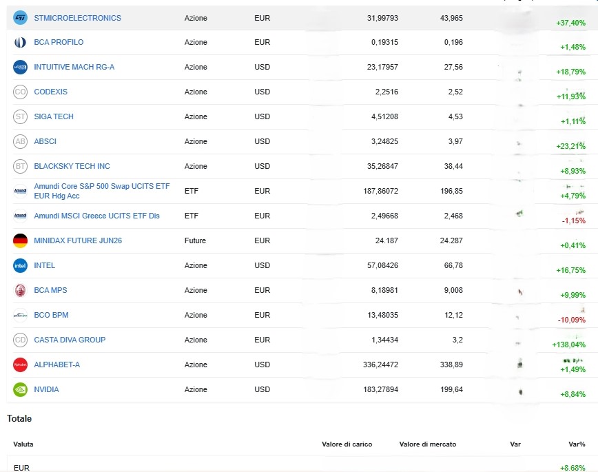 Come sempre abbiamo cancellato i valori assoluti ( con un programma AI che ha qualche pecca come si può ben vedere 🙂 ) mantenendo solo le performance percentuali dei singoli titoli e del portafoglio, che é intorno all’8,7% dalla riapertura posizioni.